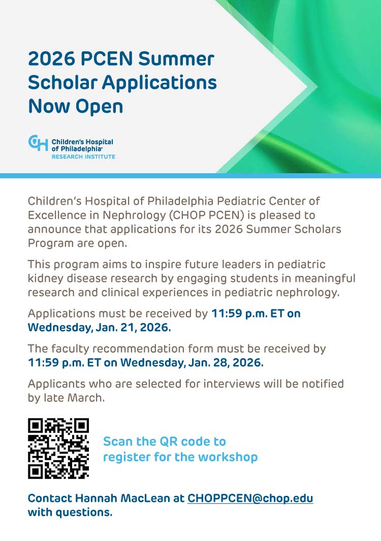 Children's Hospital of Philadelphia Pediatric Center of Excellence in Nephrology (CHOP PCEN) is pleased to announce that applications for its 2026 Summer Scholars Program are open.