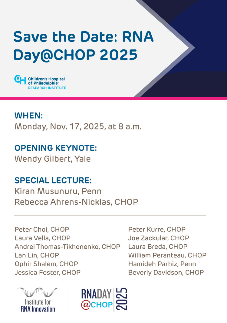 The Penn Institute for RNA Innovation and CHOP are pleased to invite staff to attend RNA Day at CHOP 2025, scheduled for Monday, November 17, 2025, at the Hub for Clinical Collaboration on the CHOP campus.